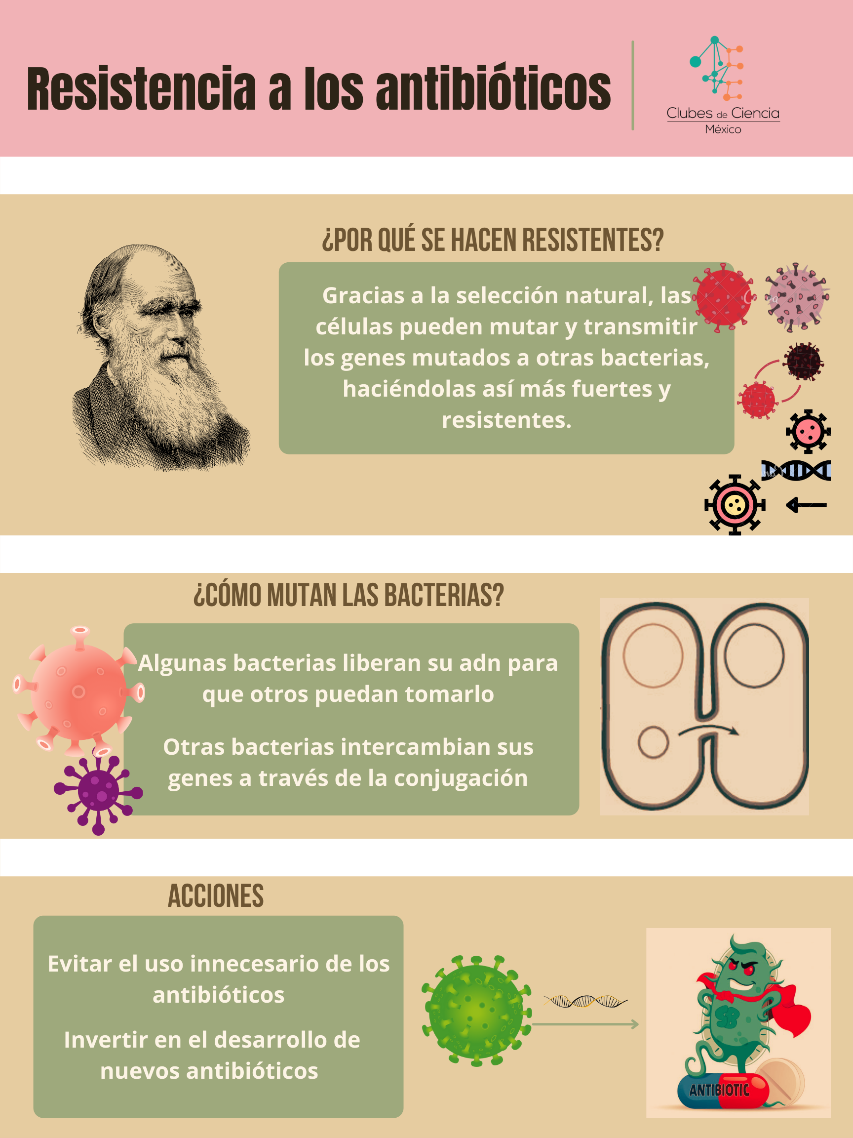 La ODS que se relaciona de manera directa con respecto a nuestro club es la de salud y bienestar, y con el propósito de afrontar este problema se utilizó como medio de propagación la divulgación científica, la cual es necesaria y requiere de ser certera y concisa para reducir el impacto de este fenómeno, limitando su propagación, para que, con ello, junto con el uso de herramientas biológicas, nos sirva para conocer los mecanismos de acción de distintas enfermedades y actuar para combatirlas. Lo cual no sólo genera buenos resultados para la eliminación de bacterias, sino que también contribuye a la investigación de más enfermedades y su tratamiento.